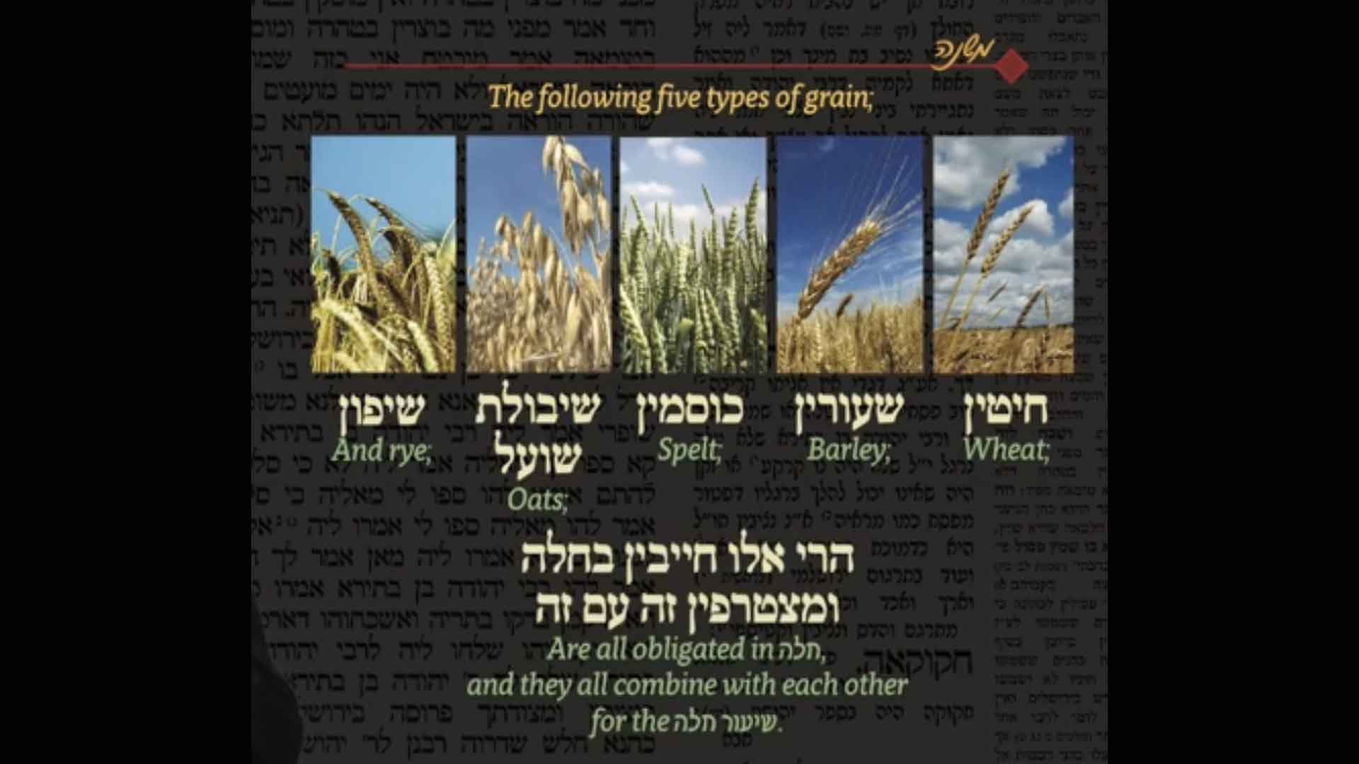 The Mishnayot in this perek have been discussing the laws of ḥadash – the new grains that are permitted only after the second day of Passover. The Mishna on our daf enumerates the types of grain that fall into this category – wheat, rye, oats, barley and spelt – all of which are also obligated in the mitzva of ḥalla.
