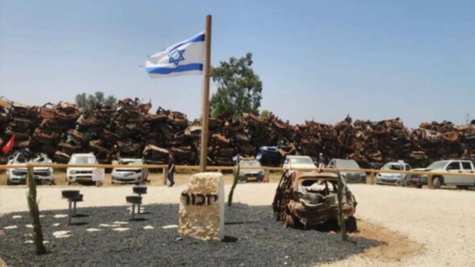 A white pickup from Nir Oz stands apart, doors flung wide, as though the driver might return, as though leaving were still possible.
